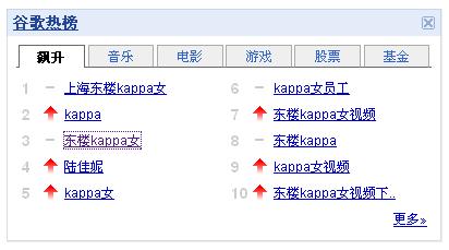 http://www.google.cn/ReBang你八卦么?以前大家八卦的时候都是街头巷尾口口相传,现在科技进步了。足不出户的我们可以利用谷歌热榜来了解现在最热门的话题。比如下面的截图:),看了你就能知道今天(11.11)最热门的不是光棍节了,而是kappa